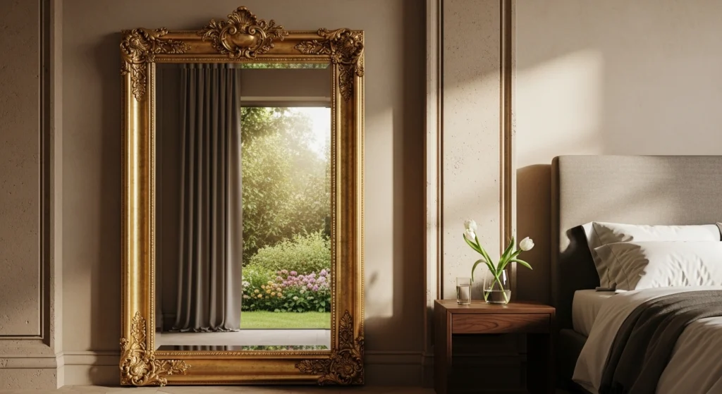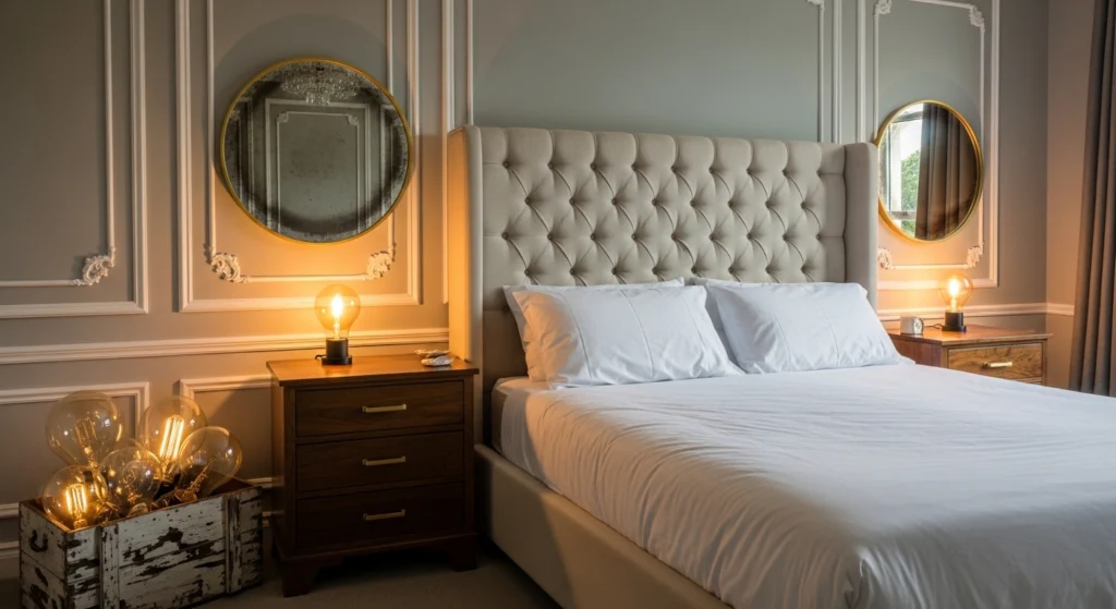 Classic Romance Meets Modern Chic utilizes the “Hard Architecture” of intricate molding and gold-framed mirrors to create a sense of symmetry and depth. The layout is anchored by a tufted headboard and vintage-inspired nightstands, providing a sense of “Grounded Materiality.” We style the space with a burning beeswax candle and a rustic wooden box of specialized bulbs to signal a commitment to seasonal revitalization. This bedroom reflects a “Collected” personality, where classic elegance is filtered through a lens of modern, professional discipline.
