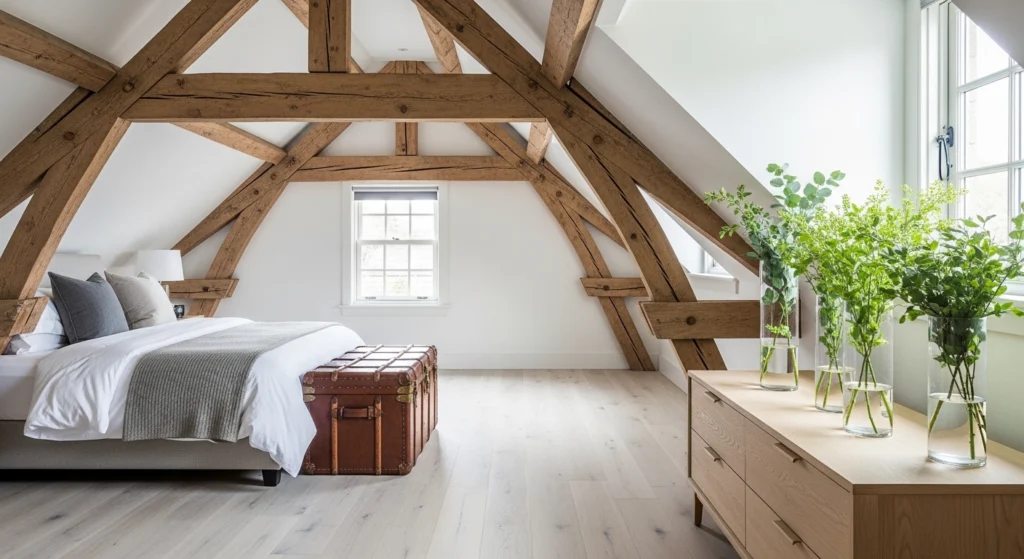 The Lofty Serenity layout celebrates the “Hard Architecture” of sloped ceilings and exposed timber beams, using a neutral palette to maintain cohesion. The space is anchored by a vintage trunk at the foot of the bed, adding a “Collected” character to the modern loft. We style the area with tall glass vases of greenery and a single glass of water to introduce an organic, refreshing feel. This bedroom is the perfect blend of loft-style modernity and gentle chic charm, creating a tranquil sanctuary that feels both expansive and grounded.