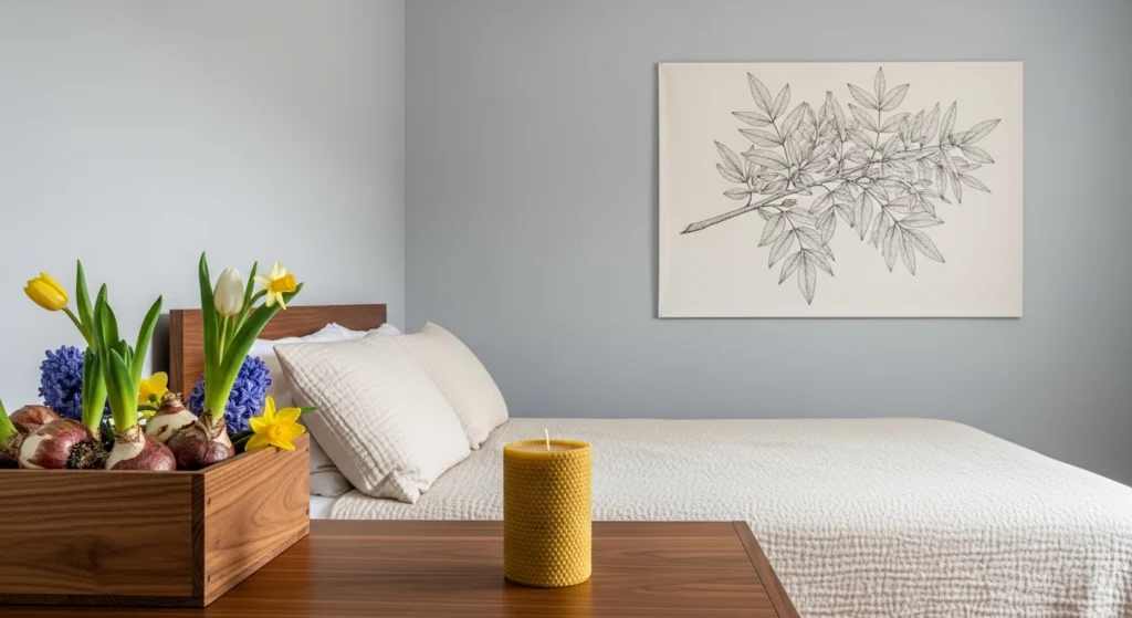 Minimal Chic Comfort is an exercise in “Zero-Waste Geometry,” where grey walls and botanical artwork create a serene, uncluttered foundation. The layout features layered bedding in taupe tones, providing a “Clean and Calm” horizon for rest. We style a distressed dresser with a rustic wooden box of specialized bulbs and a single burning beeswax candle. This functional yet sophisticated approach ensures the bedroom delivers the perfect blend of comfort and discipline, making it an ideal retreat for anyone who loves understated elegance.