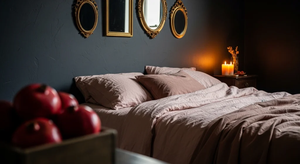 Moody Romance utilizes the dramatic contrast of deep charcoal walls and blush bedding to create a sophisticated, protective cocoon. The layout is anchored by antique mirrors and gilded frames, reflecting the “Glowy” energy of candlelight. We style the area with a rustic wooden box of fresh pomegranates and a single long-stemmed white tulip. This enchanting sanctuary mixes the old with the new, providing a “Collected” environment that feels mysterious, romantic, and deeply soulful.