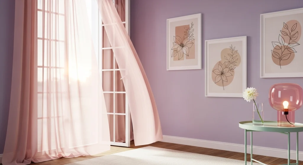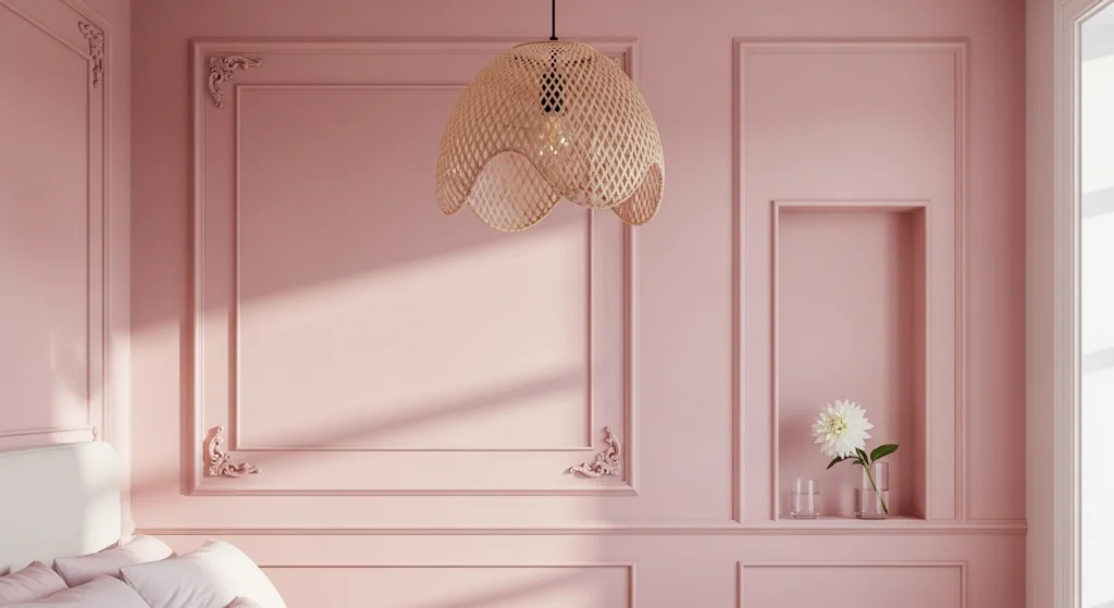 Soft Pink Modern Elegance utilizes architectural wall molding to add subtle drama to a monochromatic palette. The “Sun-Washed” atmosphere is enhanced by soft pink curtains that filter light across the wide-plank white oak floors. We ground the feminine charm with “Zero-Waste Geometry,” utilizing a rattan light fixture and pampas grass to introduce organic warmth. Styling an integrated wall niche with a single beeswax candle and a glass half-filled with water ensures the space remains a sophisticated and Seasonal Decor-inspired haven for deep rest.
