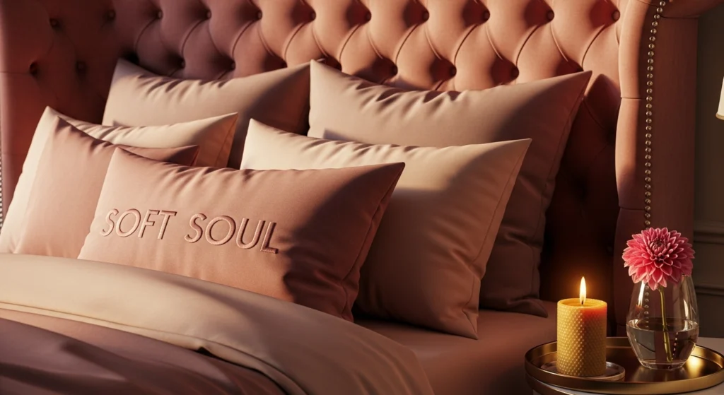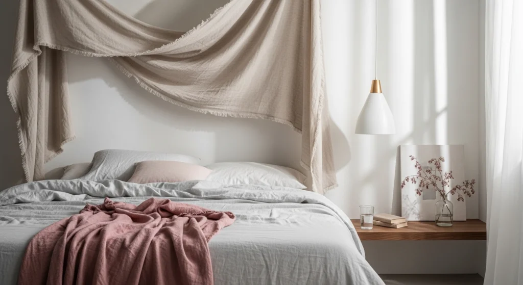 In this retreat, draped fabric above the headboard becomes a romantic focal point, creating a canopy-like effect that promotes “Visual Silence.” The layout utilizes warm, “Layered Lighting” and neutral-toned walls to foster a welcoming, restorative energy. We style the bedscape with a dusty pink throw and a glass half-filled with water on a walnut side table. This approach balances gentle romance with the structural bones of the room, ensuring the sanctuary feels like a high-end suite in a Bathroom-adjacent spa retreat.