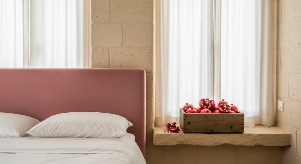 In this sanctuary, sunlight becomes a primary architectural element, pouring through sheer curtains to create a “Glowy” morning atmosphere. The “Background Architecture” of traditional wall molding is paired with a velvet blush headboard, creating a sense of Stately Permanence that feels both luxe and approachable. We anchor the creamy neutrals with a rustic wooden box holding fresh spring pomegranates on a nearby stone ledge. This layout emphasizes “Grounded Materiality,” ensuring that the mix of soft textures and refined gold accents results in a serene, elegant retreat.