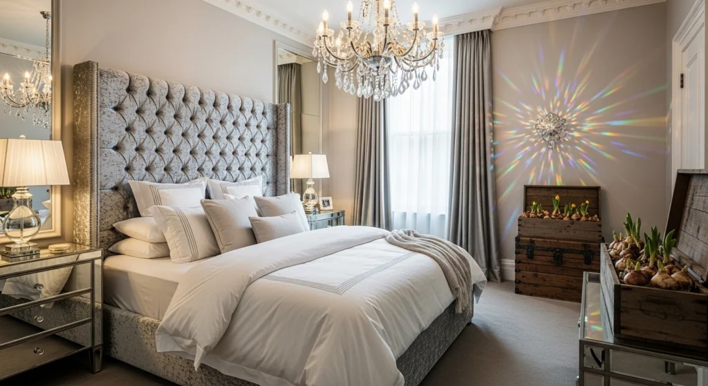 This layout is pure glamour, featuring a tufted headboard and a sparkling chandelier that casts an enchanting glow across the room. The “Hard Architecture” of carved furniture is paired with mirrored nightstands to double the perceived depth of the space. We style the center of the room with a rustic wooden box of specialized bulbs and a burning beeswax candle. Every corner is curated with “Singular Intent,” ensuring that the classic romance of the design is met with modern comfort and architectural clarity.