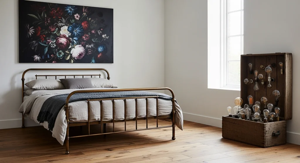 Bridging the gap between the “Collected and Creative” past and the modern present, this design utilizes oversized floral artwork as a structural focal point. The “Hard Architecture” of a brass bed frame is softened by Home Essentials like crinkled linen throws and raw-edge walnut accents. To maintain the room’s architectural soul, we place a rustic wooden box of specialized bulbs near the window to catch the light. This layout proves that Modern Chic design doesn’t need bold patterns to feel complete, favoring instead the raw honesty of natural wood and woven textures.