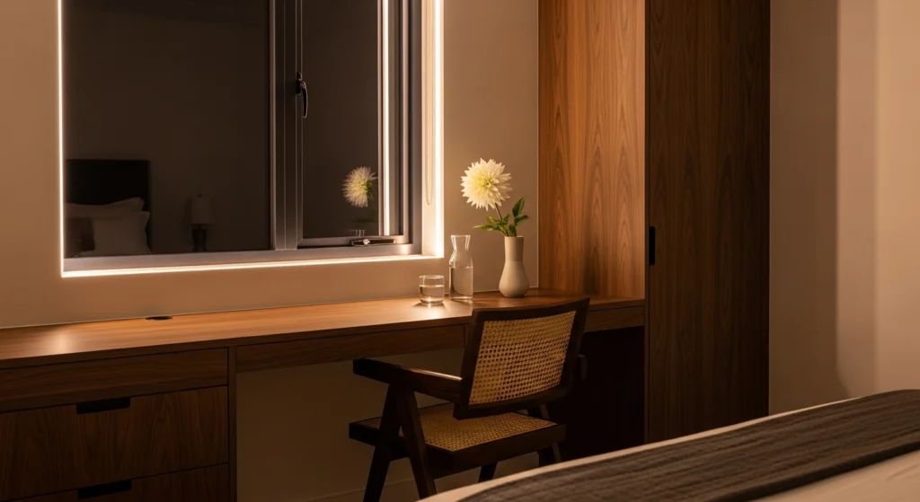 The Warm Modern Chic layout integrates a high-end workspace into the bedroom, using “Layered Lighting” and warm wood floors to maintain a cozy glow. The “Hard Architecture” of the built-in desk is balanced by the organic movement of a circular patterned rug and soft taupe bedding. We style the workspace with a single glass of water and a white dahlia to mirror the rest of the room’s aesthetic. This bedroom embodies modern chic at its finest—intentional, serene, and beautifully designed for both productivity and restoration.