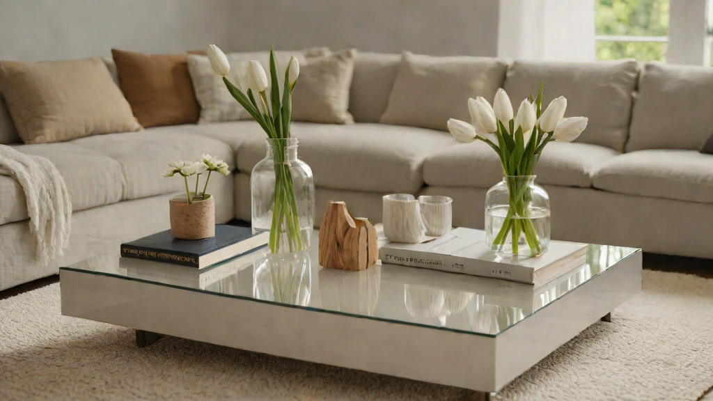 Coffee tables often become “catch-alls” for remotes and mail, creating “Visual Noise” that disrupts the room’s architectural soul. Embrace “Visual Silence” by clearing the surface and selecting only three high-fidelity items. We utilize a low-profile stone tray to anchor a single glass half-filled with water and a white tulip. This layout prioritizes “Zero-Waste Geometry,” allowing the wide-plank white oak floors below to remain the primary focus.