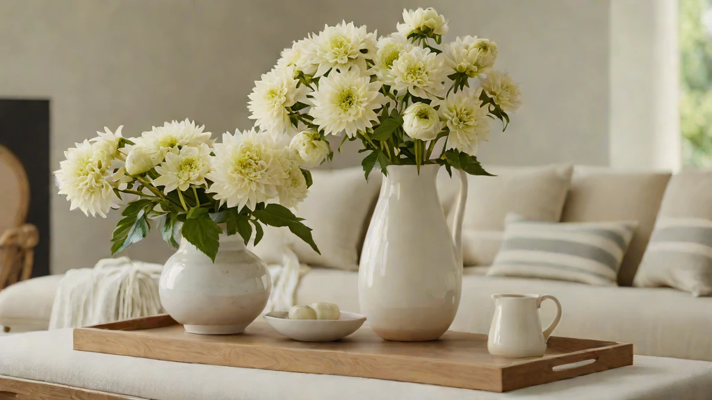 Monochromatic rooms can feel “one-dimensional” without a focus on seasonal shifts. Introduce rich contrast by placing a dark charcoal vase on a light oak table. Fill the vase with oversized seasonal branches to draw the eye upward and celebrate the home’s “Hard Architecture.” Style with a glass of water and a white dahlia for a fresh, optimistic touch.