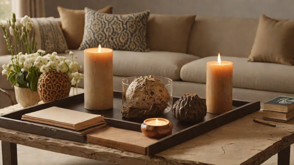 Curated collections can easily look like “clutter” if they lack a unifying structural theme. Use a large, hand-carved wooden tray to group your objects into a single architectural unit. This creates a state of Stately Permanence, making the collection feel like an intentional part of the room’s bones. Pair this with a single flickering beeswax candle for a “Glowy” evening atmosphere.