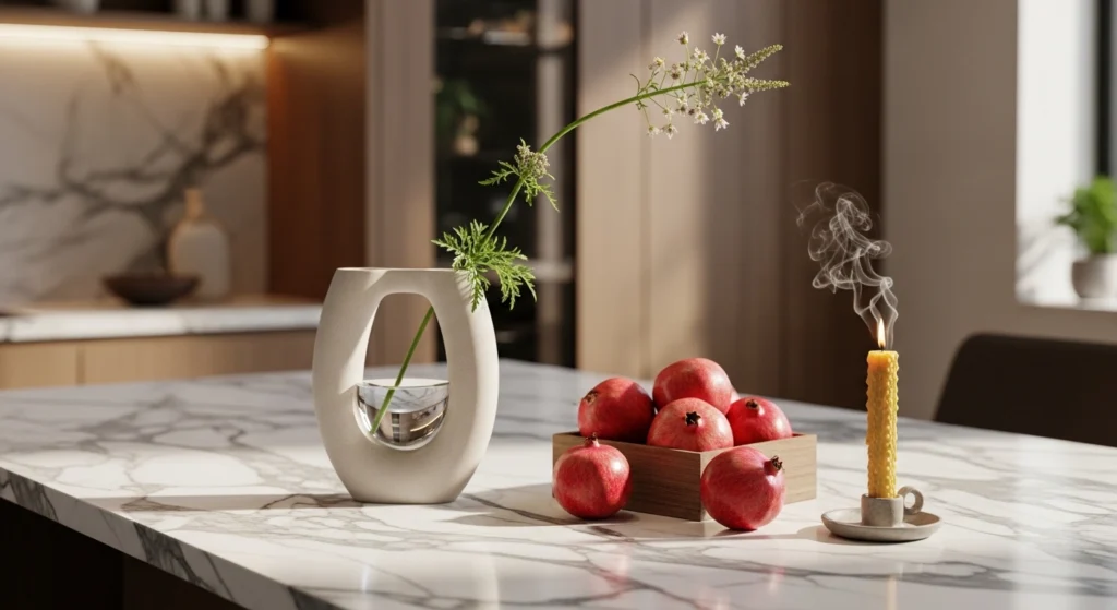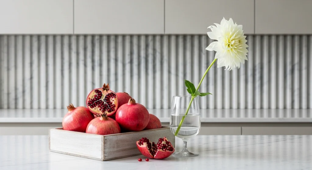 Everyday surfaces, like the kitchen island and side tables, should be the first to reflect the “Spring Reset” through minimalist, active decor. Clear away the heavy clutter of winter and replace it with a single, clean vignette: a wooden box of fresh spring pomegranates, a glass half-filled with water, and a single long-stemmed white dahlia. This styling emphasizes “Singular Intent,” where each object is given room to breathe and catch the sun. The background architecture—perhaps a fluted marble vanity or a white oak countertop—provides the high-end foundation for these seasonal moments. This approach ensures your daily routine is grounded in a sense of freshness and seasonal revitalization, making the home feel curated and high-intent.