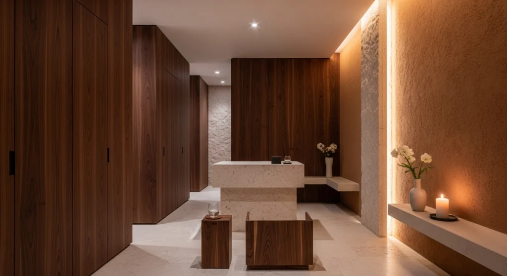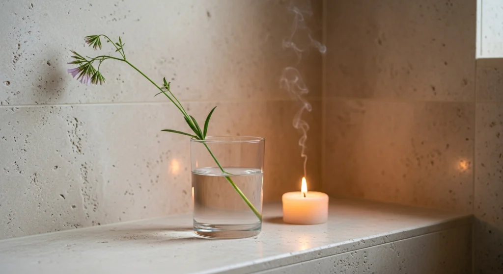 To elevate the bathroom’s seasonal soul, we introduce “Soft Greens” through botanical-scented candles and “Simple Florals” in minimalist vases. A clear glass half-filled with water holding a long-stemmed wildflower placed on a stone shelf adds a touch of “Active Decor” that feels fresh and life-affirming. We pair these elements with high-end materials like honed travertine or slate to provide a sense of “Grounded Materiality” and permanence. This focus on “Visual Silence” and natural textures ensures the bathroom feels like a private wellness retreat, reflecting a lifestyle of quiet luxury and sophisticated design. It is a space that prioritizes the sensory experience, where the glow of a candle and the freshness of a flower create a restorative atmosphere.
