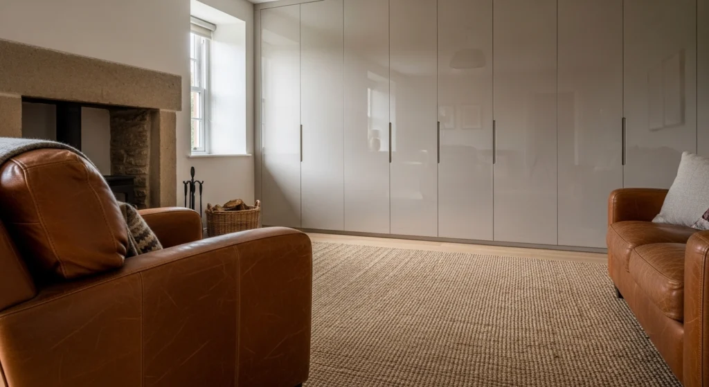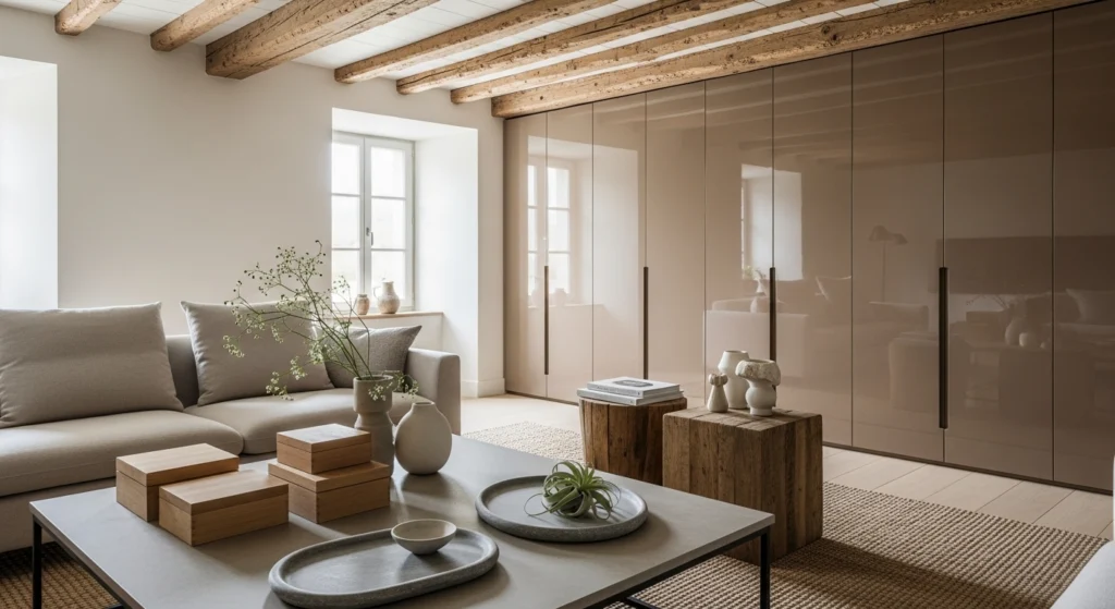 The most sophisticated transitional homes master the balance between the lingering need for “Cozy Comfort” and the desire for a “Spring-Ready” aesthetic. We achieve this by grounding the room in a monochromatic palette of neutrals—mushroom, sand, and parchment—that bridge the gap between seasons. A large jute rug provides an earthy, grounded foundation, while a cognac leather armchair adds a “Collected” sense of history and warmth. By utilizing a “Background Architecture” of seamless built-in wardrobes in a matching neutral lacquer, you create a serene environment where light and texture can play. This disciplined approach ensures the room feels cohesive and architecturally sound, avoiding the jarring transitions of typical seasonal decorating.
