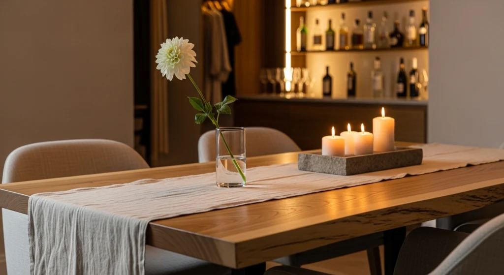 For transitional spring dining, we prioritize “Effortless Elegance” through the use of light textiles and “Active Decor” vignettes. Use a raw-edge white oak table as your canvas, layering it with a soft, wrinkled linen runner in a pale oatmeal hue. Instead of a crowded centerpiece, choose a single glass half-filled with water with a long-stemmed white dahlia and a few burning candles on a stone tray. The “Background Architecture” should include a floor-to-ceiling built-in wardrobe serving as a hidden bar or larder to keep the dining area uncluttered. This approach creates a social sanctuary that feels both high-end and intimate, where the quality of the materials and the soft lighting are the primary features of the meal.
