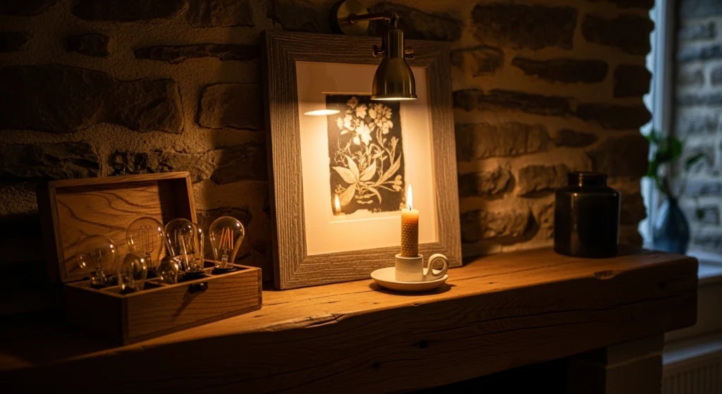Elevating your transitional decor is about the masterful use of “Layered Lighting” and architectural depth on your mantelpiece. Instead of a single light source, combine the flicker of a beeswax candle with a small brass picture light to illuminate a piece of seasonal art. This creates a “Glowy” and intimate atmosphere that highlights the textures of your masonry and the grain of your timber mantle. Incorporate “Active Decor” like a wooden box of specialized bulbs to add a layer of organic interest. This layered approach ensures the fireplace remains the soulful heart of the cottage or modern home, providing warmth and inspiration as the days grow longer and the winter weight lifts.