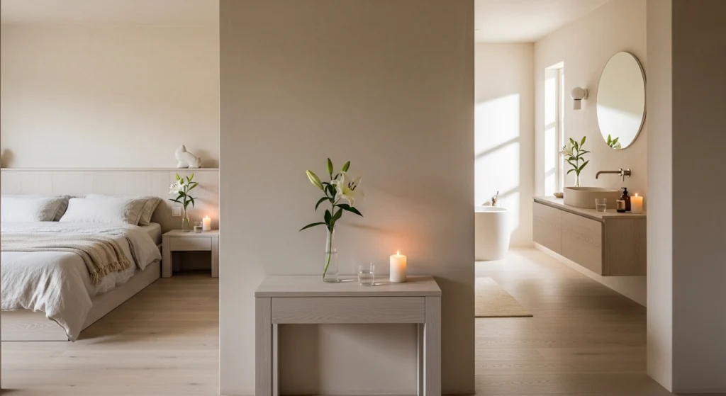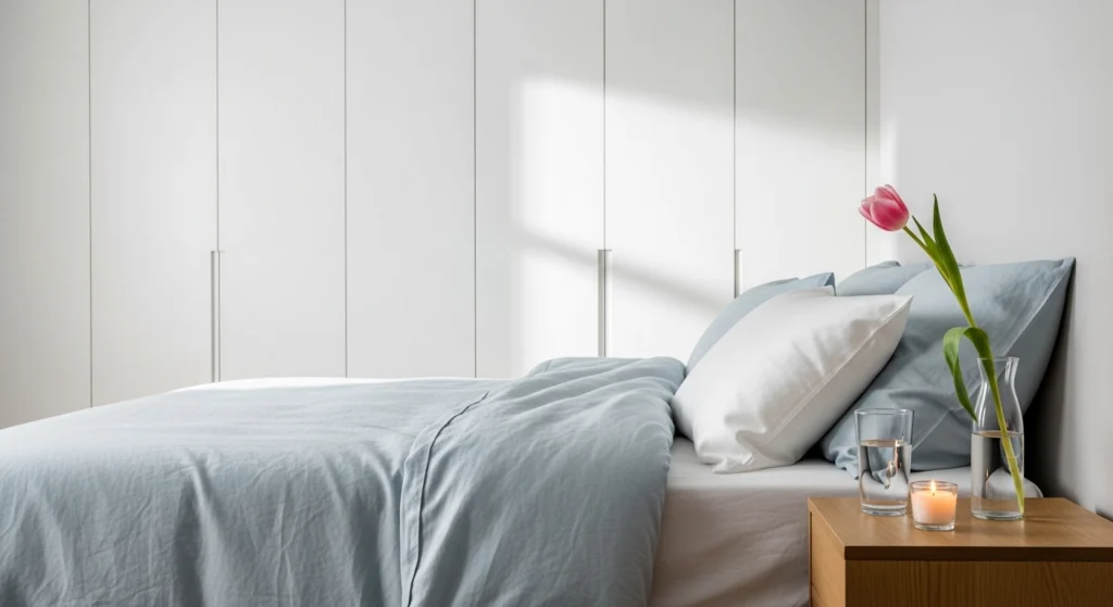 In the bedroom, the winter-to-spring transition focuses on creating an “Atmospheric Retreat” through airy layers and soft, botanical textiles. Replace heavy duvets with lightweight linen bedding and silk pillows in shades of bone and sage. We utilize “Background Architecture” like a seamless white built-in wardrobe wall to provide “Visual Silence” and eliminate all “life clutter” from the sleep zone. On the light-oak bedside table, place a glass half-filled with water and a single long-stemmed tulip next to a small burning candle. This minimalist styling ensures the bedroom feels expansive and optimistic, providing a sophisticated sanctuary for rest and seasonal revitalization.