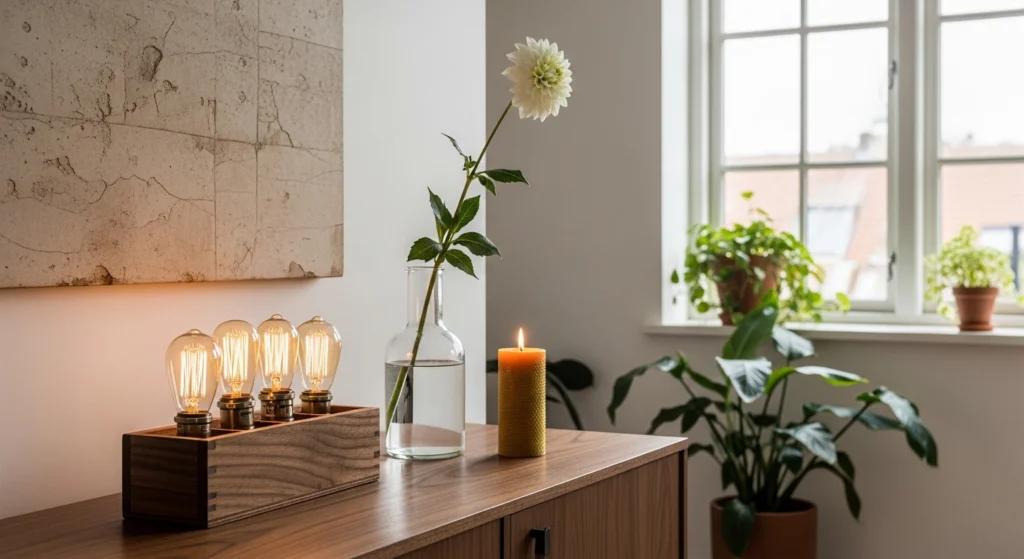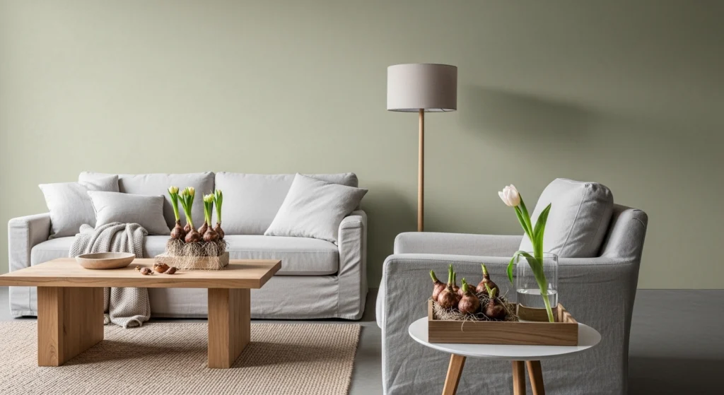 A noticeable transformation doesn’t require a total overhaul; it relies on “Zero-Waste Geometry” and intentional swaps that alter the room’s energy. Replace the heavy winter candles with slow-burning beeswax pillars and trade dark stoneware for clear glass and light-oak trays. These simple changes allow the spring light to pass through objects rather than being absorbed by them, instantly lightening the “Visual Volume” of the space. On the coffee table, a wooden box of specialized bulbs and a glass half-filled with water with a single flower serve as a minimalist focal point. These swaps reflect a high-end designer’s eye, focusing on the quality of light and the honesty of materials to signal the change of season.