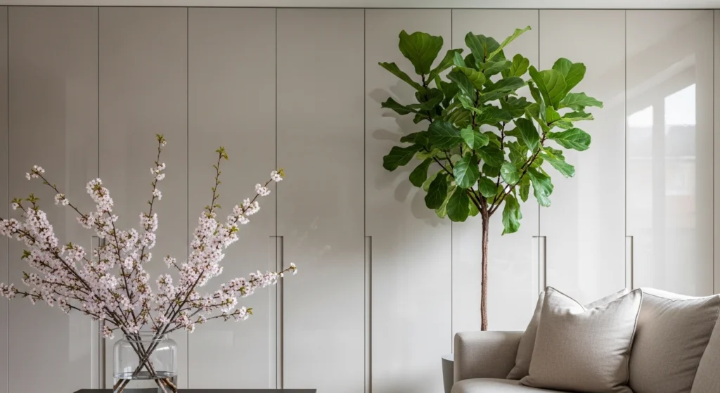 Nothing facilitates the move from winter to spring more effectively than the strategic layering of “Fresh Greenery” as a living architectural element. We move away from the dense evergreen boughs of the cold months and toward the structural beauty of a single long-stemmed monstera leaf or a branch of flowering cherry blossoms. Place these in clear glass vases half-filled with water to celebrate the transparency and freshness of the season. This biophilic approach ensures the home feels “Collected and Creative,” where the plants are treated as art rather than mere filler. Position large-scale plants, like a tall fiddle-leaf fig, near your built-in wardrobes to create a “Soft Soul” contrast against the hard, seamless lines of the cabinetry.