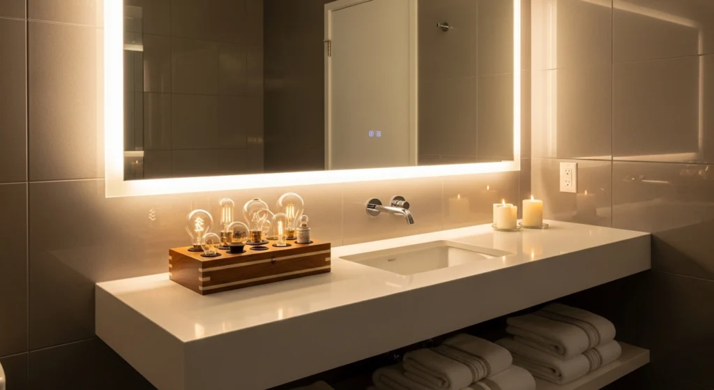 Lightening the bathroom for spring involves a focus on “Textural Clarity” and the use of subtle green accents to energize the space. Swap out dark winter mats for light-toned jute or woven cotton and replace heavy robes with lightweight linen versions. We utilize “Background Architecture” like integrated LED lighting behind a mirror to create a soft, architectural glow that eliminates harsh shadows. A small wooden box on the vanity holding specialized bulbs and a single burning candle provides a touch of “Warm Modern” soul to the room. This approach ensures the bathroom feels expansive and fresh, providing a high-end backdrop for your spring morning routine and seasonal revitalization.