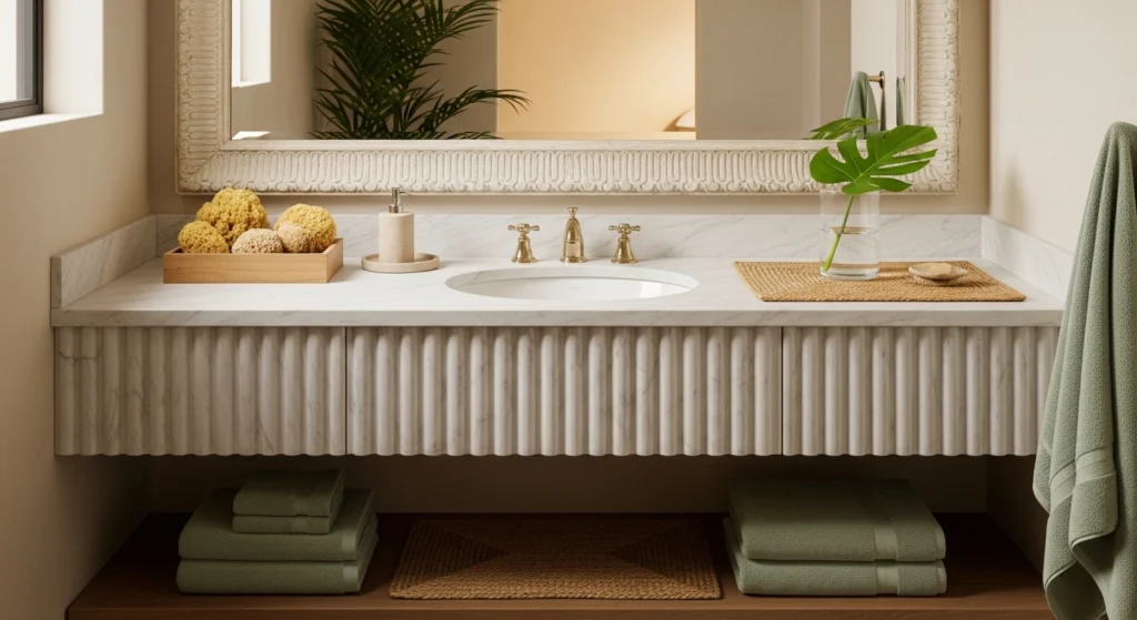 The bathroom transition utilizes “Aqueous Serenity” and light green accents to create a spa-like environment for seasonal self-care. We incorporate “Soft Soul” textures through plush linen towels in a pale sage hue and a large jute mat on the floor. The “Background Architecture” should include a fluted marble vanity and a large frameless mirror that reflects the light and any greenery from a nearby window. On the counter, place a wooden box for sponges and a glass half-filled with water with a single green leaf. This “Clean and Calm” approach ensures the bathroom feels high-end and restorative, providing a tranquil sanctuary to begin and end your day.