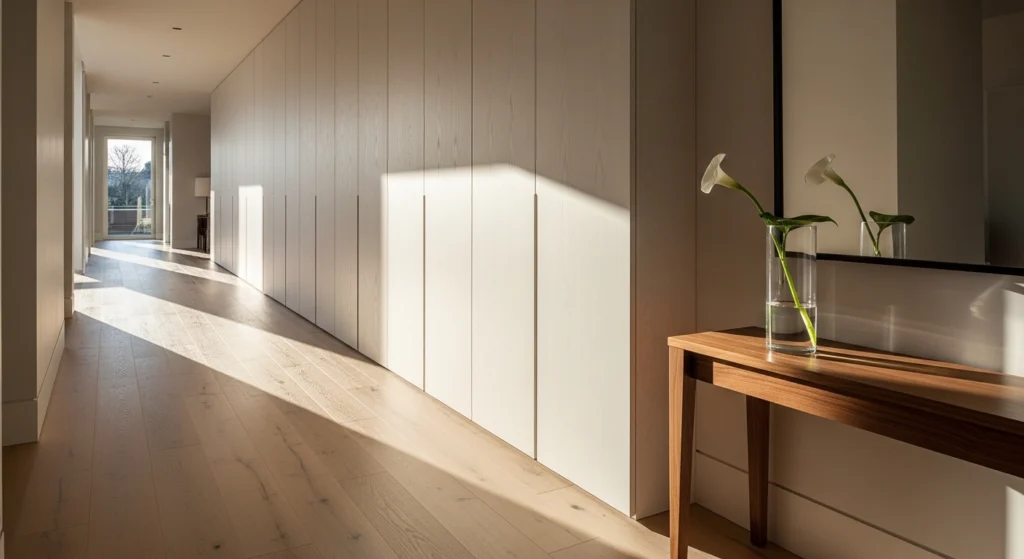 The entryway and hallways are the “Connective Tissue” of your home and must be styled with the same architectural intent as the main living areas. We use “Background Architecture” like seamless built-in wardrobes for coat storage to ensure these high-traffic zones remain completely uncluttered and “Clean and Calm.” A simple walnut console table in the hallway, styled with a glass half-filled with water and a long-stemmed flower, provides a moment of visual peace as you move through the house. The use of large-plank white oak flooring and light-toned walls ensures these transitional spaces feel expansive and sun-washed. This “Whole-Home” approach to the spring transition creates a cohesive sanctuary that welcomes you with a sense of order and seasonal freshness.