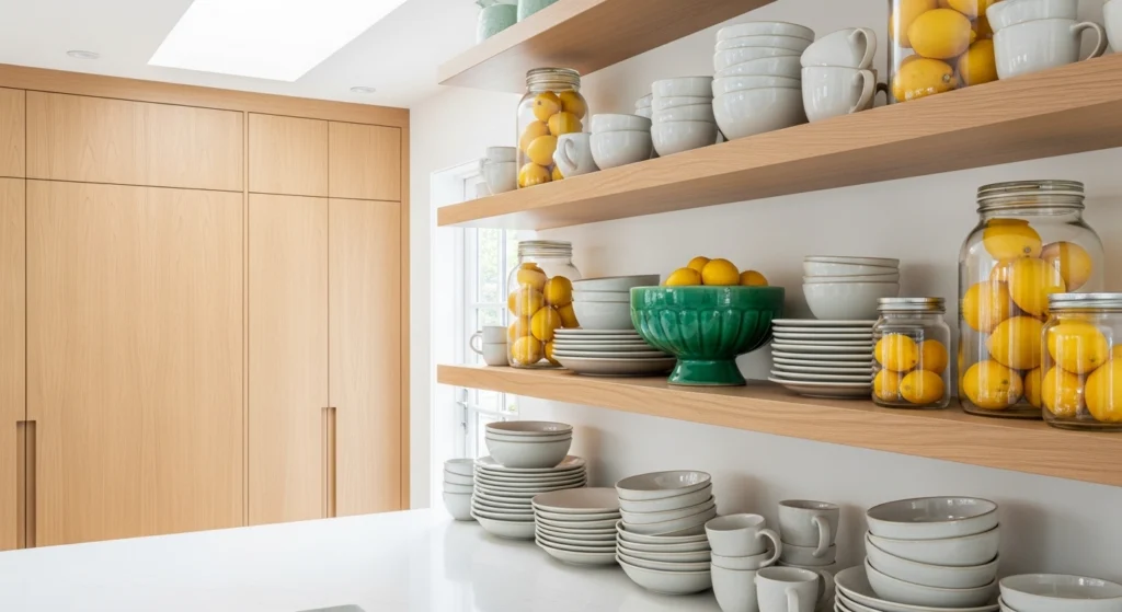 The kitchen transition focuses on “Functional Styling” and the use of fresh, organic color to energize the heart of the home. We utilize “Background Architecture” like seamless built-in wardrobes for pantry storage to keep the marble or white oak counters clear and expansive. On the open shelving, style a mix of light-toned ceramics and clear glass jars filled with spring ingredients like lemons or herbs. Introduce a “pop” of fresh color through a Wasabi Green or Jade accent—perhaps a ceramic bowl or a linen tea towel. This “Collected and Creative” approach ensures the kitchen feels like a vibrant social hub, ready for the lighter meals and social gatherings of the spring season.