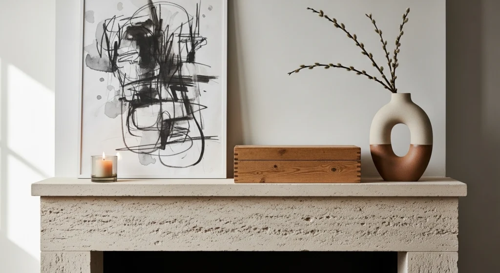 The mantel and console table are the architectural focal points of your transition, requiring a balance of “Hard Architecture” and “Subtle Details.” Use an asymmetrical grouping on the mantel: one large abstract sketch, a rustic wooden box, and a sculptural ceramic vase half-filled with water holding a branch of pussy willow. This “Collected and Creative” styling ensures the mantel feels like a piece of living art rather than a stagnant holiday display. The background architecture—whether it be dry-stack stone or smooth Roman clay—should be highlighted by the soft light of a single burning candle. These details anchor the room in the current season while maintaining a timeless, high-end aesthetic that reflects a sophisticated lifestyle.