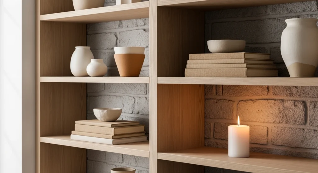 Open shelving offers a unique opportunity to practice “Visual Silence” by editing and restyling for the spring months. Remove the heavy books and dark pottery of winter, replacing them with light-toned ceramics, tan-covered books, and clear glass jars. Ensure there is plenty of “Negative Space” on each shelf, allowing the “Background Architecture” of the built-in unit to show through. A single burning candle placed on a lower shelf provides a soft, architectural glow that highlights your “Collected” treasures. This disciplined approach to shelving ensures the walls feel like a part of the room’s expansive energy, providing a sophisticated backdrop for your creative life during the transition into spring.