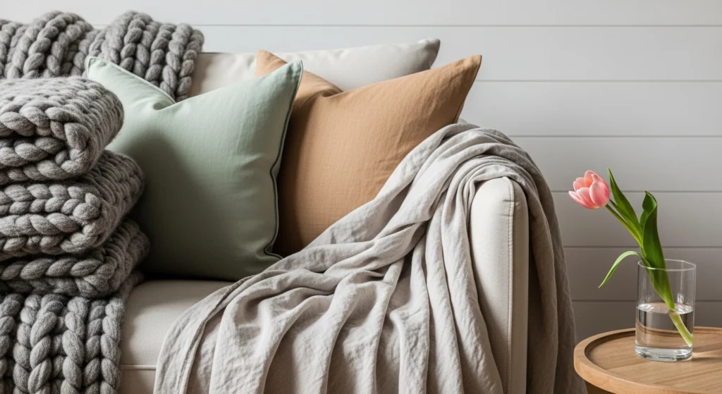 Transitioning is an exercise in “Textural Subtraction”—gradually removing the heavy, dark winter layers and replacing them with lighter, spring-ready touches. Swap out the chunky wool throws for lightweight linen blankets in a pale oatmeal or bone hue, and trade velvet cushions for silk-linen blends in shades of sage and sand. This prevents the room from feeling “cold” during the early spring weeks while still providing a noticeably “Clean and Calm” visual reset. The goal is to maintain a sense of “Warm Modern” comfort while introducing a breezier, more optimistic energy. These subtle textile swaps add “Micro-Shadows” to your furniture, creating depth and tactile luxury without the visual weight of winter materials.