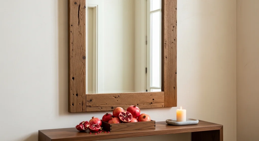 The entryway is the first chapter of your seasonal story, and it should offer a “Stately Welcome” through natural, realistic styling. Position a large leaning mirror with a rustic timber frame opposite the front door to “Capture” the spring light and double the perceived space of the entry. On the console, place a wooden box of fresh pomegranates and a single burning candle on a stone tray. This sensory anchor engages guests immediately, signaling a home that values “Quiet Luxury” and seasonal revitalization. By keeping the background architecture monochromatic—bone or mushroom tones—you ensure that the natural textures of the wood and stone are the primary features of the welcome.