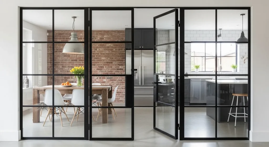 To create a sense of flow and modern transparency, replacing a solid wall with black steel-framed glass doors (often called Crittall-style) is a stunning architectural upgrade. These doors allow natural light to pass between the kitchen and dining area, making both spaces feel larger while still providing a physical barrier for noise and cooking smells. The thin black frames act as a graphic element that “frames” the view into the dining room, making the furniture inside look like a curated display. This industrial-yet-elegant feature is a favorite for open-plan homes that want to maintain distinct zones.