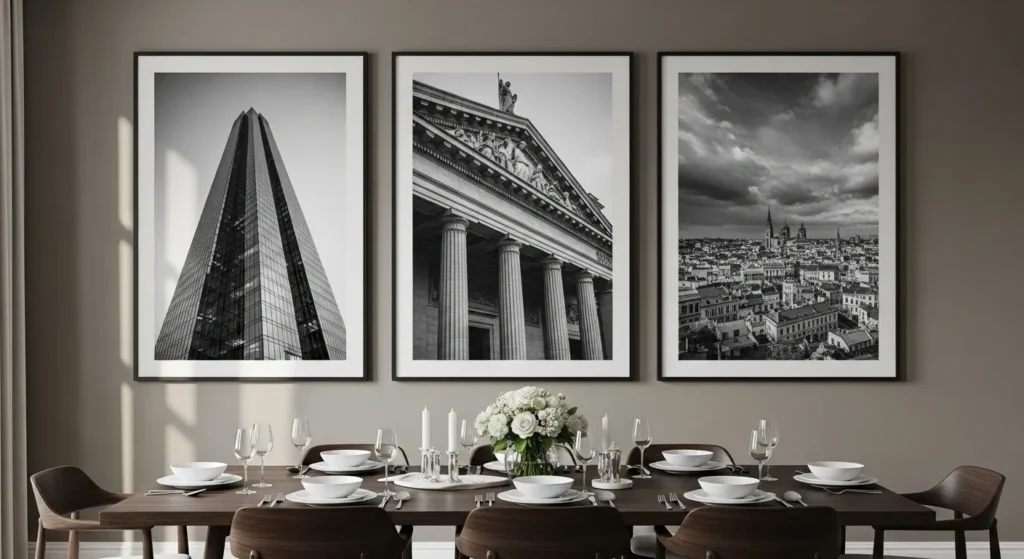 Art in a modern dining room doesn’t always have to be abstract; a series of high-contrast black and white photographs can provide a sophisticated, cinematic feel. Whether it’s architectural details, nature close-ups, or street photography, the monochromatic nature of the images keeps the room feeling cohesive and calm. Using oversized white mats and slim black frames creates a “window” effect that adds depth to the walls. This approach is perfect for those who want a dining room that feels like a curated gallery, offering a timeless aesthetic that never goes out of style.