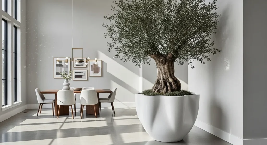 Pro Tip: If your dining room doesn’t get enough light for a large tree, a set of high-quality preserved moss panels on the wall can provide the same green effect without the maintenance.