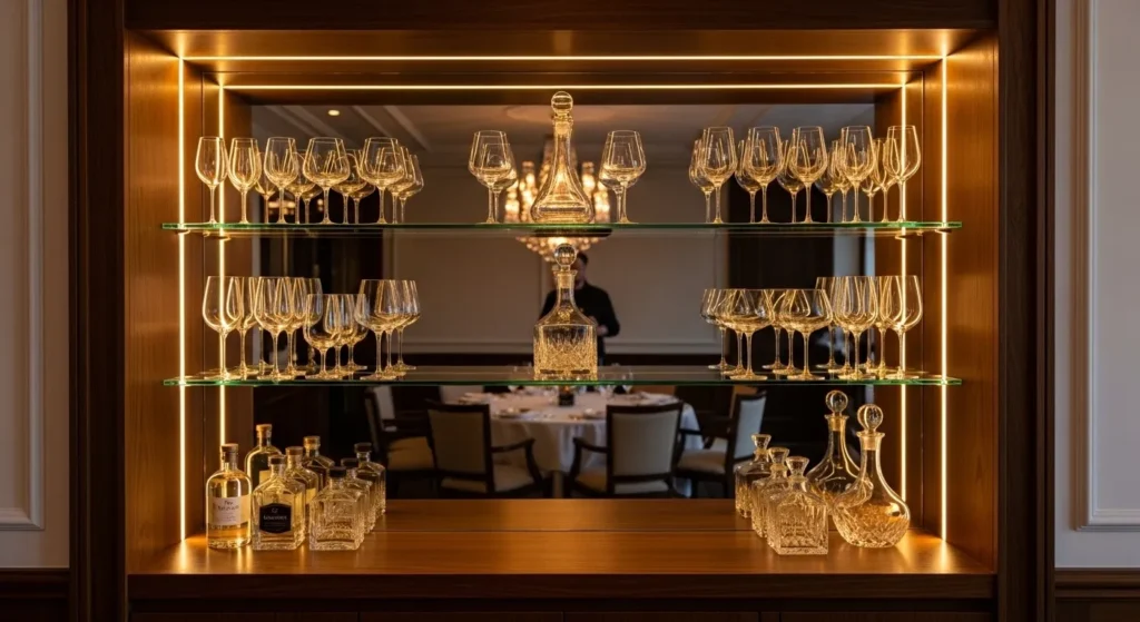 An elegant dining room often doubles as an entertaining suite, and an integrated built-in dry bar is the ultimate functional luxury. By carving out a niche in the wall or utilizing an unused corner, you can install custom cabinetry that houses glassware, wine bottles, and cocktail tools. Using a contrasting interior material, like mirrored glass or a dark wood veneer, makes the bar feel like a high-end boutique feature. It allows you to serve drinks without leaving the room, keeping the focus on your guests and enhancing the sophisticated, “club-like” atmosphere of the home.