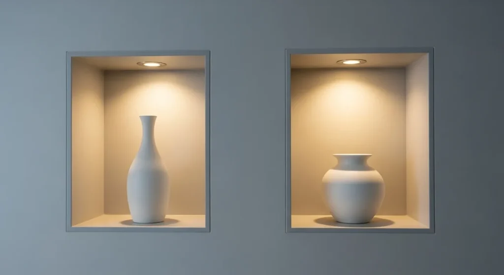 Custom-built wall niches are a sophisticated way to display curated art pieces or high-end ceramics without the need for bulky shelving units. By “carving” these shelves directly into the drywall and adding integrated puck lighting at the top, you create a gallery-style display that feels permanent and architectural. This keeps the floor space clear and allows the walls themselves to contribute to the room’s decorative story. Whether used to house a collection of white porcelain or a single bronze sculpture, these lit niches provide a soft secondary light source that enhances the overall mood of the room.