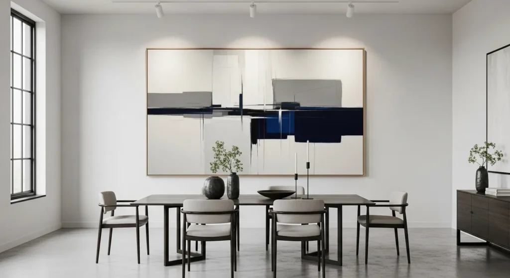 Every elegant dining room needs a primary focal point, and a single, large-scale piece of abstract art is the perfect modern choice. Rather than a gallery wall of smaller frames, one oversized canvas creates a sense of gallery-like grandeur and serves as a conversation starter for guests. Choose a piece that either complements the room’s color story or provides a dramatic contrast to inject personality into the space. The absence of a complex frame—opting instead for a “gallery wrap” or a slim floater frame—keeps the look clean and emphasizes the artwork itself as a high-end designer element.