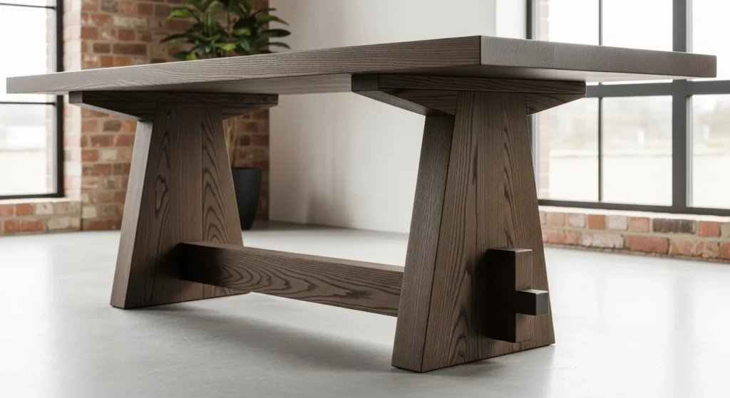 The trestle table has been updated for the modern era with slim profiles and sharp, geometric angles, making it a favorite for “Rustic Modern” or “Organic Minimalist” homes. A dark-stained oak trestle table provides a heavy, grounded presence that feels substantial and high-quality. The visible joinery and the structural beauty of the base act as a design feature in themselves, removing the need for a tablecloth or elaborate centerpieces. This style of table is incredibly sturdy and perfect for large families, offering a timeless look that bridges the gap between traditional craftsmanship and modern simplicity.