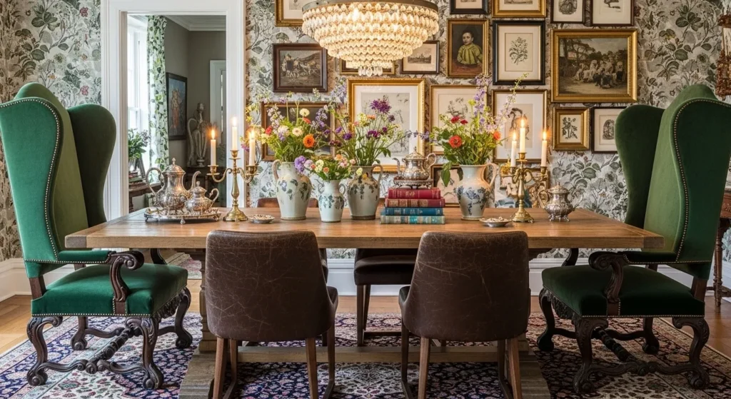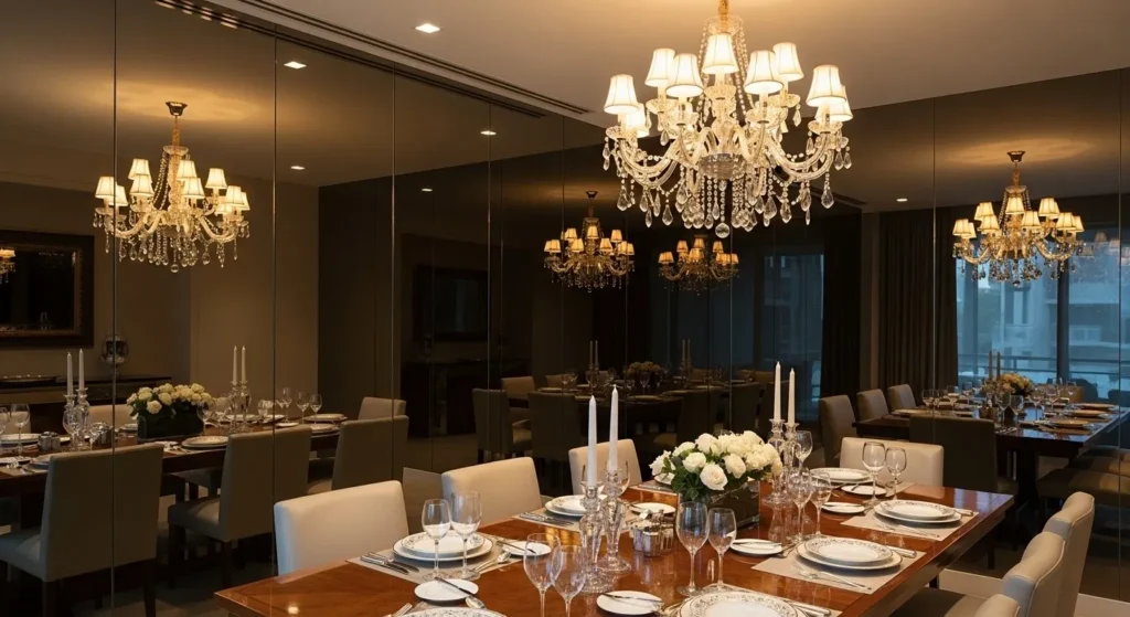 For smaller dining rooms or those lacking natural light, a floor-to-ceiling mirrored wall is a classic modern trick to double the perceived size of the space. By using “antiqued” or smoke-tinted mirrors, you avoid the clinical look of a standard gym mirror and instead add a layer of vintage-inspired elegance. The mirror reflects your statement chandelier and the candlelight from the table, multiplying the sparkle and creating a magical, high-energy environment for evening entertaining. It is a bold architectural choice that makes the dining room feel expansive, bright, and incredibly glamorous.