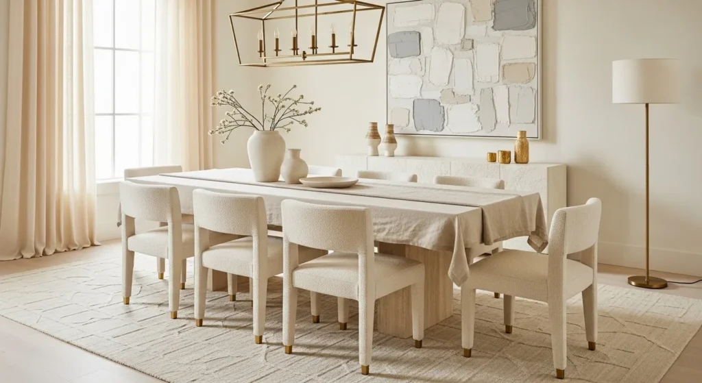 For a dining room that feels effortlessly chic, a monochrome color palette—focusing on varying shades of white, cream, and gray—creates a serene and cohesive environment. The key to making a monochrome room look expensive rather than flat is the layering of different textures and the strategic use of metallic accents. Incorporating brushed gold, polished chrome, or matte black through your lighting, hardware, and table accessories provides the necessary “spark” to elevate the neutral tones. This approach allows the architectural features of the room and the quality of the furniture to take center stage without distraction.