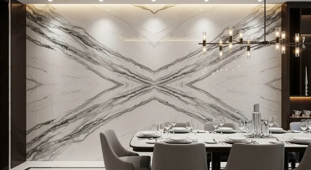 Moving beyond paint and wallpaper, a natural stone accent wall—using large slabs of book-matched marble, travertine, or slate—is the pinnacle of modern dining luxury. This brings an incredible organic texture and a sense of permanence to the room that no other material can replicate. The stone acts as a massive piece of natural art, with its veins and patterns providing a dramatic backdrop for a minimalist dining set. When properly lit with recessed ceiling “wall-wash” lights, the stone glows and reveals its intricate details, creating an atmosphere that feels like a high-end luxury hotel or a modern art gallery.