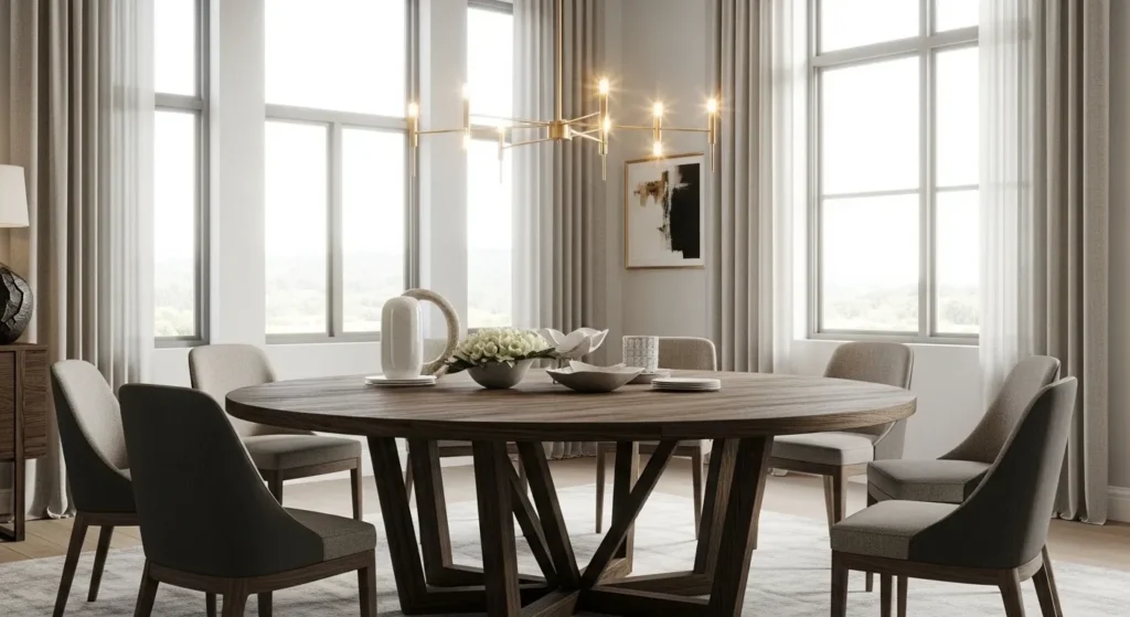 While rectangular tables are traditional, a large round dining table is a modern designer secret for creating a more intimate and social atmosphere. Round tables remove the “head of the table” hierarchy, allowing everyone to face one another and participate easily in a single conversation. In a modern setting, a round table with a bold, chunky base made of concrete or dark oak serves as a powerful geometric statement. This shape is also ideal for smaller or square-shaped dining rooms, as the lack of sharp corners improves the flow of movement around the space, making it feel less cramped.