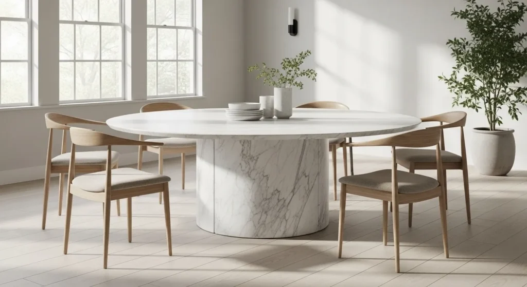 The dining table is the heart of the room, and a sculptural marble pedestal table is the ultimate symbol of modern luxury. Unlike traditional four-legged tables, a central pedestal base—often crafted from matching stone or contrasting metal—allows for more legroom and creates a clean, unobstructed silhouette. Marble, with its unique natural veining, ensures that your table is a one-of-a-kind piece of art that brings an organic yet polished element to the space. Whether you opt for the classic white Carrara or a dramatic black Nero Marquina, a stone table provides a cool, durable surface that elevates every meal.