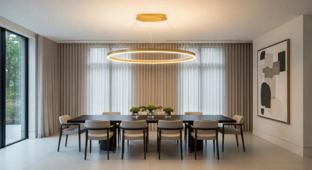 In a modern dining room, the lighting fixture is often the “jewelry” of the space, and nothing says elegance quite like a large-scale, minimalist ring chandelier. These circular fixtures, often featuring integrated LED strips or delicate glass globes, provide a soft, even glow that illuminates the entire table without the visual clutter of traditional crystal drops. The geometric simplicity of the ring shape complements both rectangular and round tables, creating a sense of balance and architectural intent. When hung at the correct height—typically 30 to 36 inches above the tabletop—it grounds the dining set and creates an intimate “room within a room” feeling.