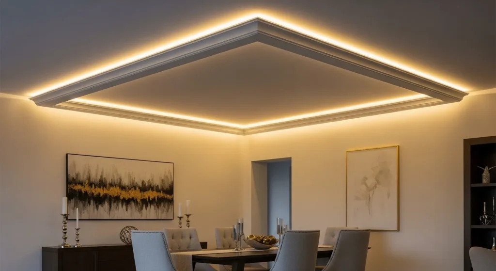 To truly finish an elegant dining room, look up at the transition between the walls and the ceiling. Modern coving—a simple, flat molding—can be installed with a “gap” that houses a hidden LED light strip. This creates a “cove lighting” effect where the entire ceiling appears to be glowing and floating. It provides a soft, shadow-less light that is incredibly relaxing and highlights the height of the room. It is the ultimate “luxury hotel” finishing touch that makes a dining room feel expensive and professionally designed, providing the perfect ambiance for high-end entertaining.