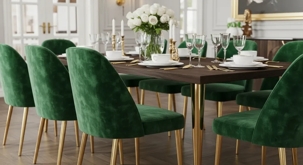 To soften the hard surfaces of a modern dining table, velvet upholstered chairs are a must-save idea for an elegant home. Velvet has a natural sheen that catches the light beautifully, adding a layer of “soft luxury” that makes guests want to linger long after the meal is over. Choosing deep jewel tones like emerald green, sapphire blue, or burnt orange provides a pop of color that grounds a neutral room and adds a sense of regal sophistication. Modern silhouettes, featuring slim metal legs or curved “barrel” backs, ensure that the chairs feel current rather than dated.