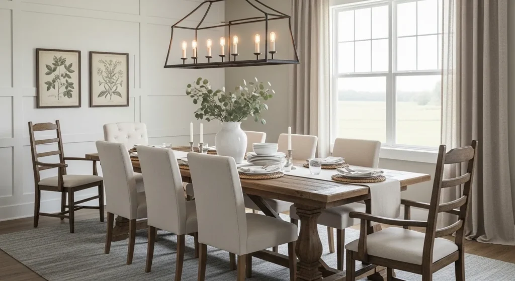 This style blends rustic charm with modern simplicity. A wooden table paired with modern chairs creates balance.