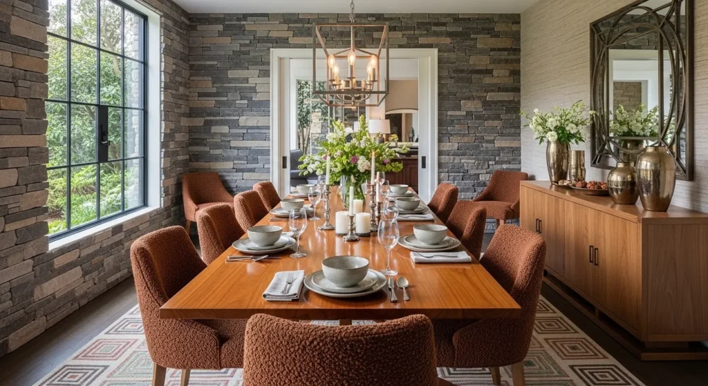 Rustic dining rooms feel grounded and comforting. Natural wood tables, earthy colors, and textured fabrics create a space that feels warm and welcoming. This style is perfect if you want your dining room to feel relaxed and homey.