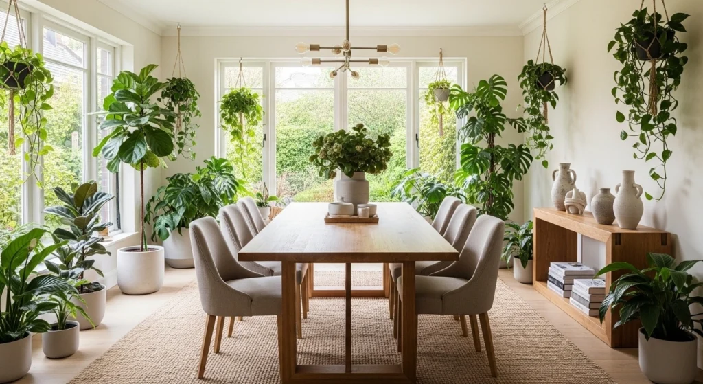 Nature-inspired dining rooms bring the outdoors inside. Wood, plants, and natural textures make the space feel calm and grounding.