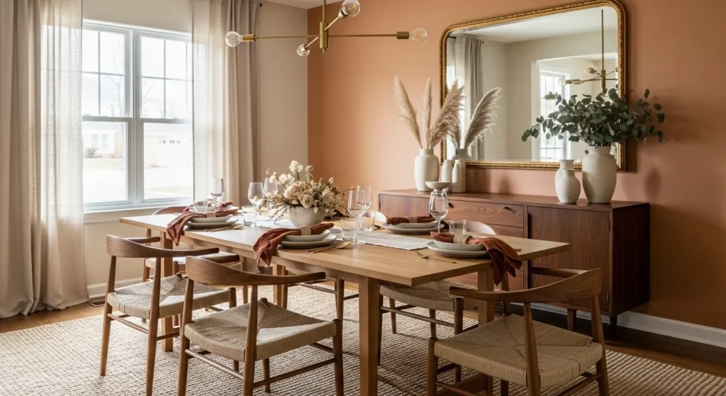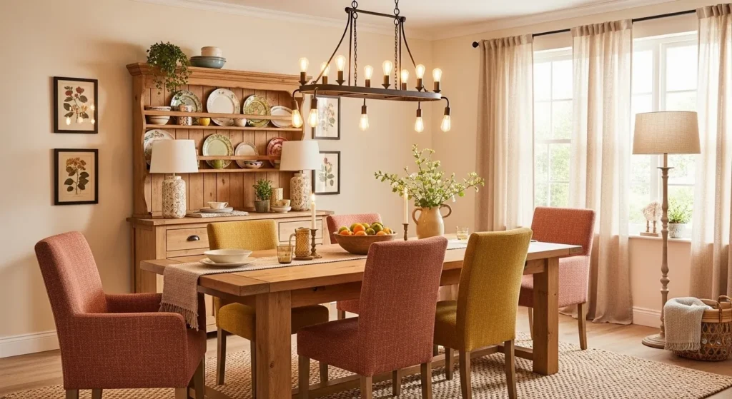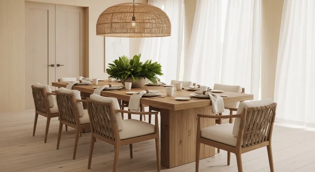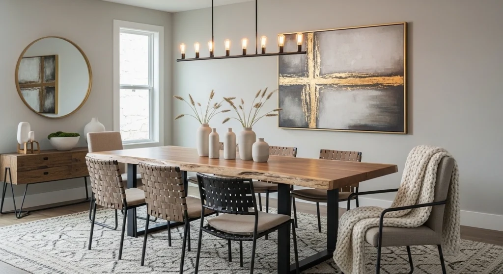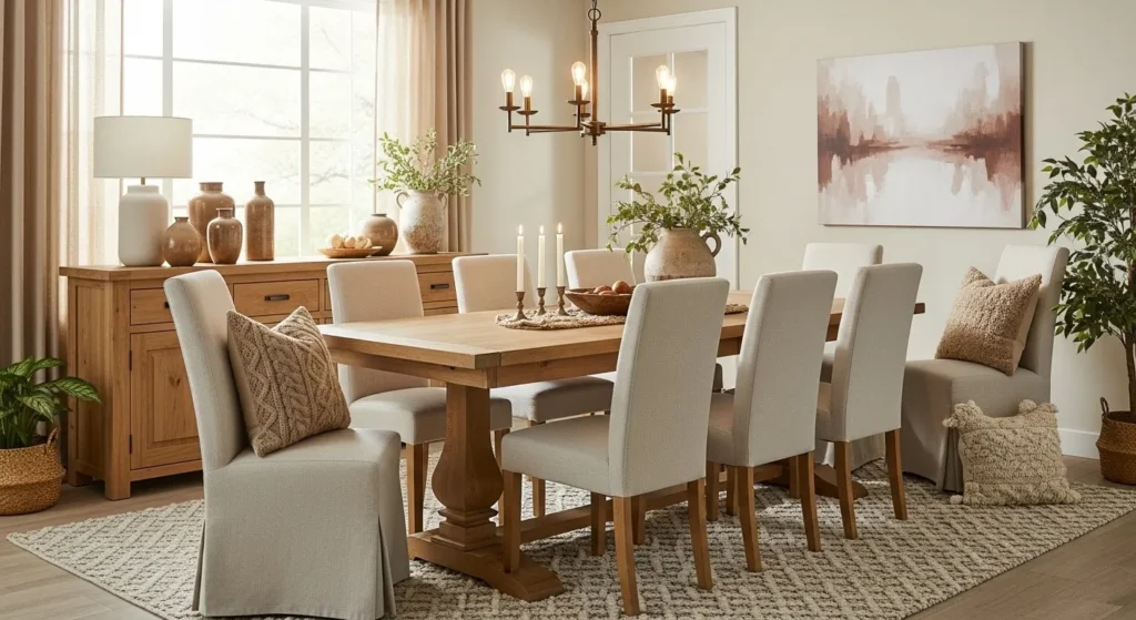 This style works well for everyday meals and special dinners because it feels relaxed and stylish at the same time. Adding small decorative touches like candles or a simple centerpiece makes the room feel lived-in.