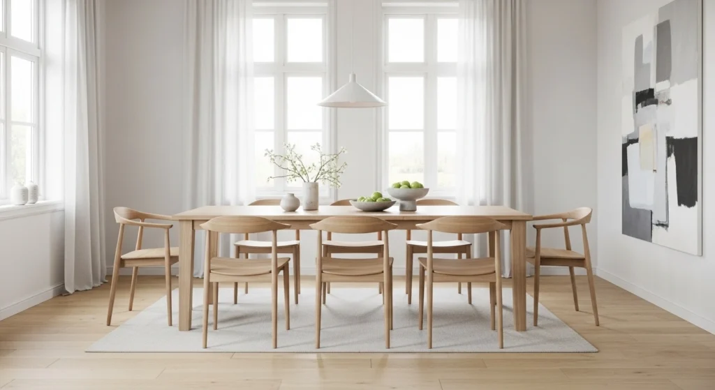 Scandinavian dining rooms are bright, simple, and functional. Light wood furniture, white walls, and soft textiles make the space feel fresh and open.