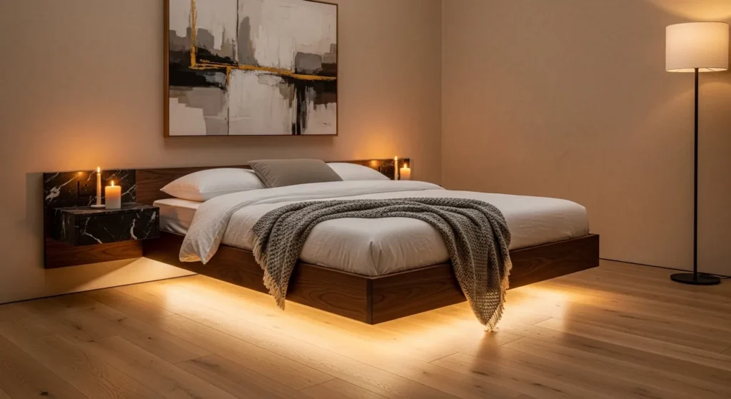 For the most compact rooms, the Floating Furniture layout utilizes “Negative Space” to create the illusion of an expansive floor plane. By selecting a bed frame with a recessed plinth or “floating” bedside ledges that are wall-mounted, you keep the perimeter of the room visible and clear. This strategy emphasizes the grain of your wide-plank white oak floors and allows for “Layered Lighting” to be installed underneath the bed for a “Glowy” evening effect. The background architecture is kept minimal, with Roman clay walls providing a sueded texture that absorbs the shadows and adds a sense of “Hard Architecture” value. Style a floating shelf with a wooden box of fresh pomegranates and a slow-burning beeswax candle to ground the modern, airy aesthetic in organic materiality and sensory warmth.